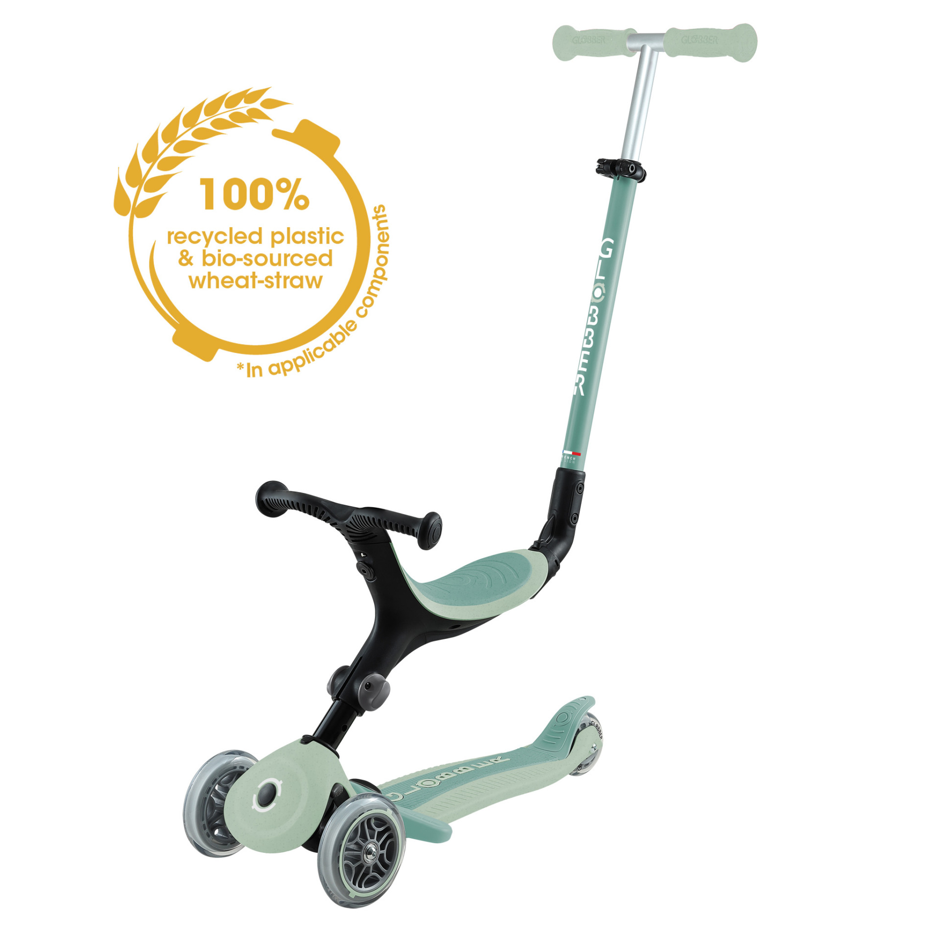Een groenere wereld op wielen: GO•UP ACTIVE ECOLOGIC helpt gezinnen over de hele wereld ecologische waarden en keuzes na te leven en te ademen. Hij is gemaakt van 100% Global Recycled Standard-plastic en biologisch tarwestro*.