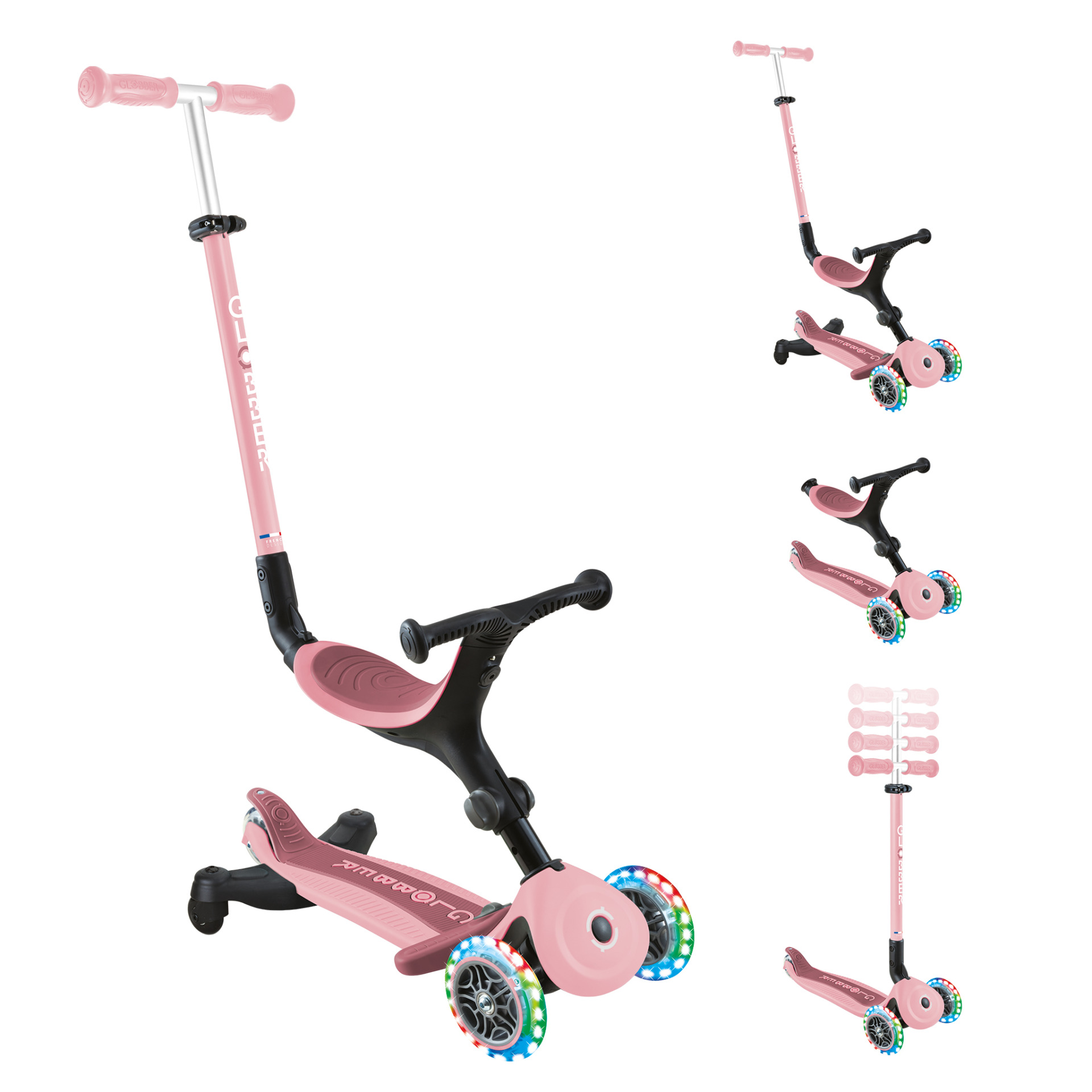 GO•UP ACTIVE LIGHTS 360° is een 3-wielige opvouwbare step met licht en zitje voor peuters en kinderen die kan worden omgebouwd tot een loopfiets, loopfiets en peuterstep. De loopfiets- en loopfietsstanden zijn ontworpen voor peuters van 15-36 maanden en de stepstand wordt aanbevolen voor kinderen van 3-9 jaar en ouder.