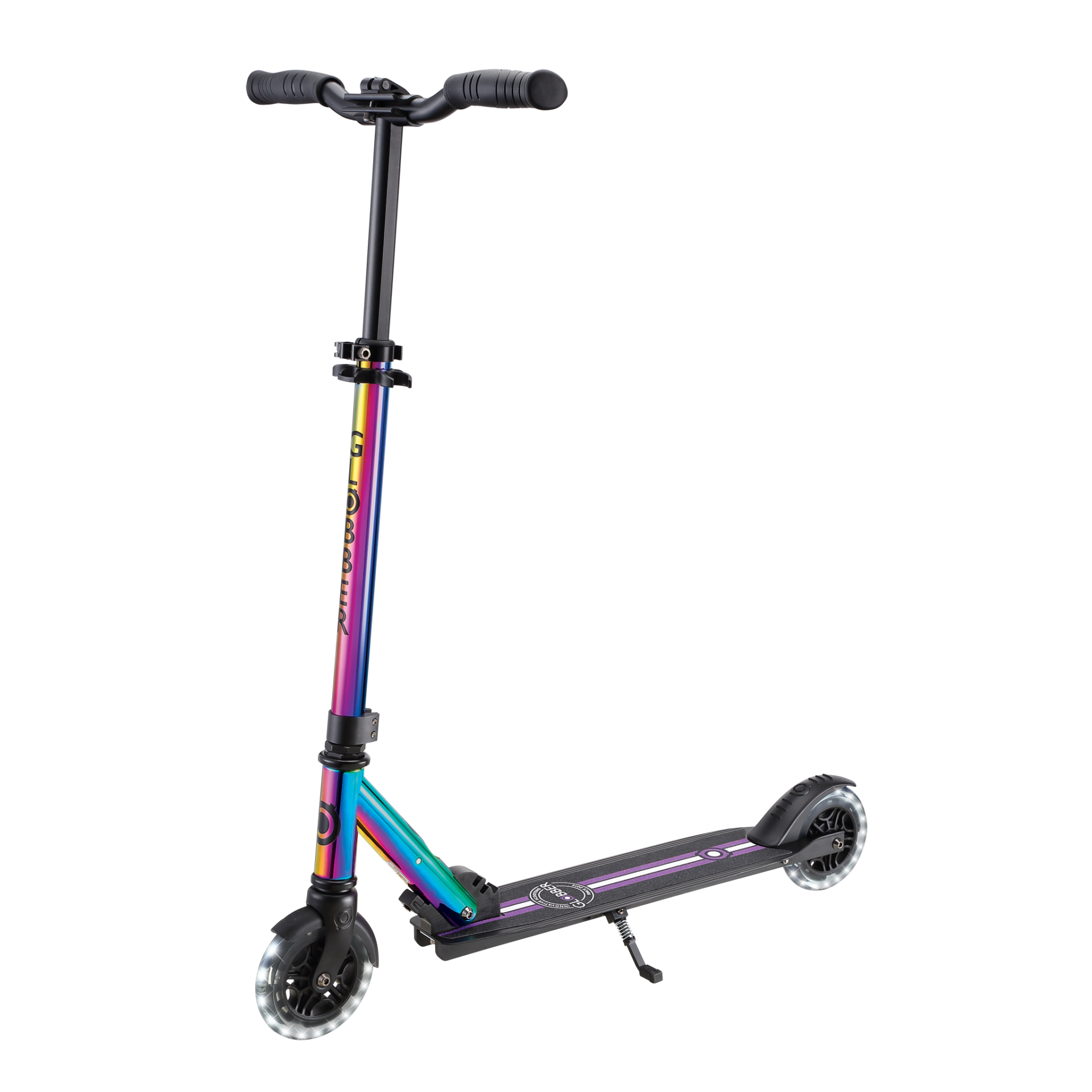 Comprising a robust triple deck structure, each FLOW scooter is also equipped with a 4-height adjustable T-bar, folding system, and self-standing mode.