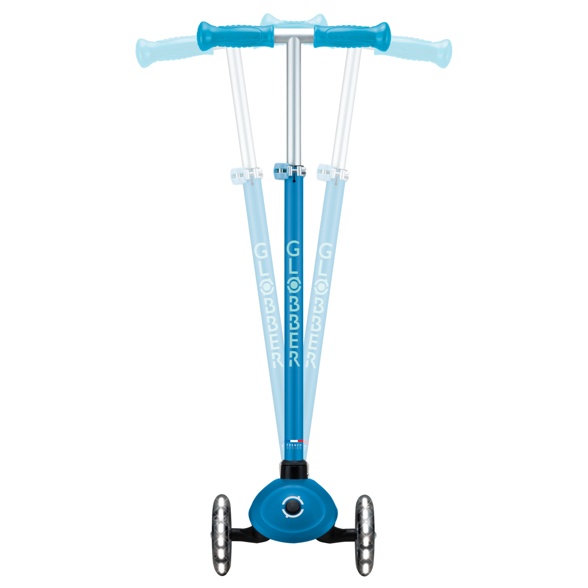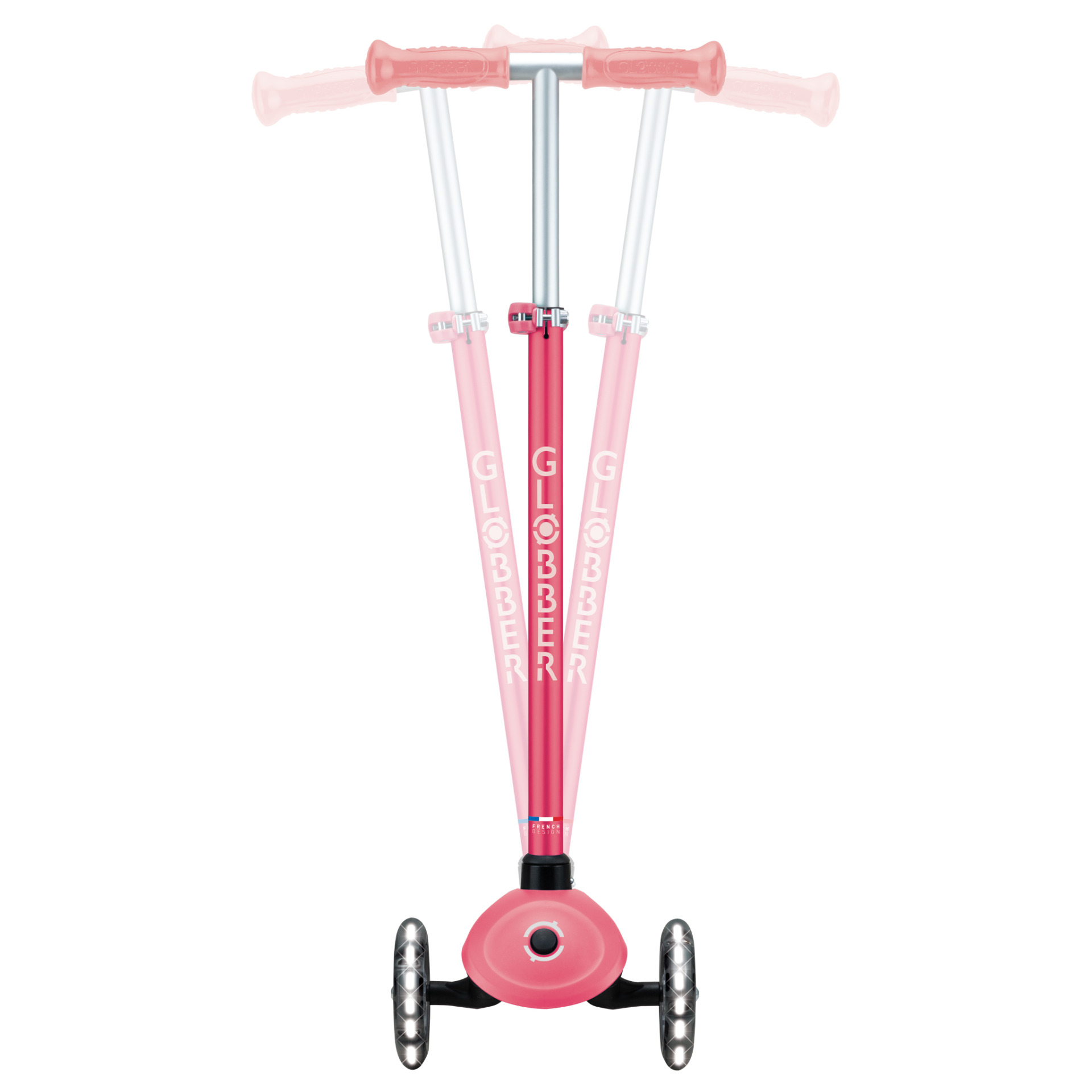 PRIMO PLUS LIGHTS GLOW 3-wheel glow-in-the-dark scooter also features Globber’s patented steering lock system, a durable and anti-slip deck, a 4-height adjustable T-bar, and LED light-up front wheels that flash in white, ensuring an effortless and glow-tastic ride that grows with your child for years of fun, active play!