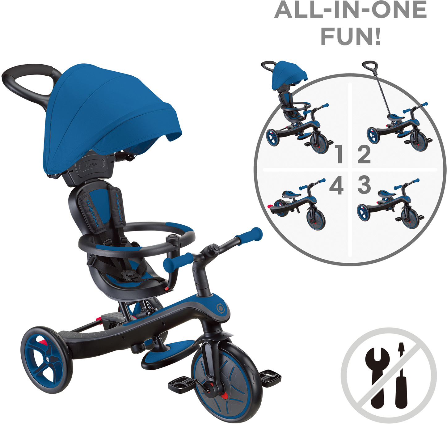 Das EXPLORER TRIKE 4in1 verfügt über ein 100% werkzeugloses Design (kein Werkzeug erforderlich!), einen patentierten Radmechanismus, einen 2-fach höhenverstellbaren Elterngriff, einen 2-fach höhenverstellbaren Sattel, einen Hochlehner-Sitz, eine abnehmbare Fußstütze, EVA-Schaumstoffräder und eine intelligente Pedalaufbewahrung, die noch mehr Funktionalität bietet!