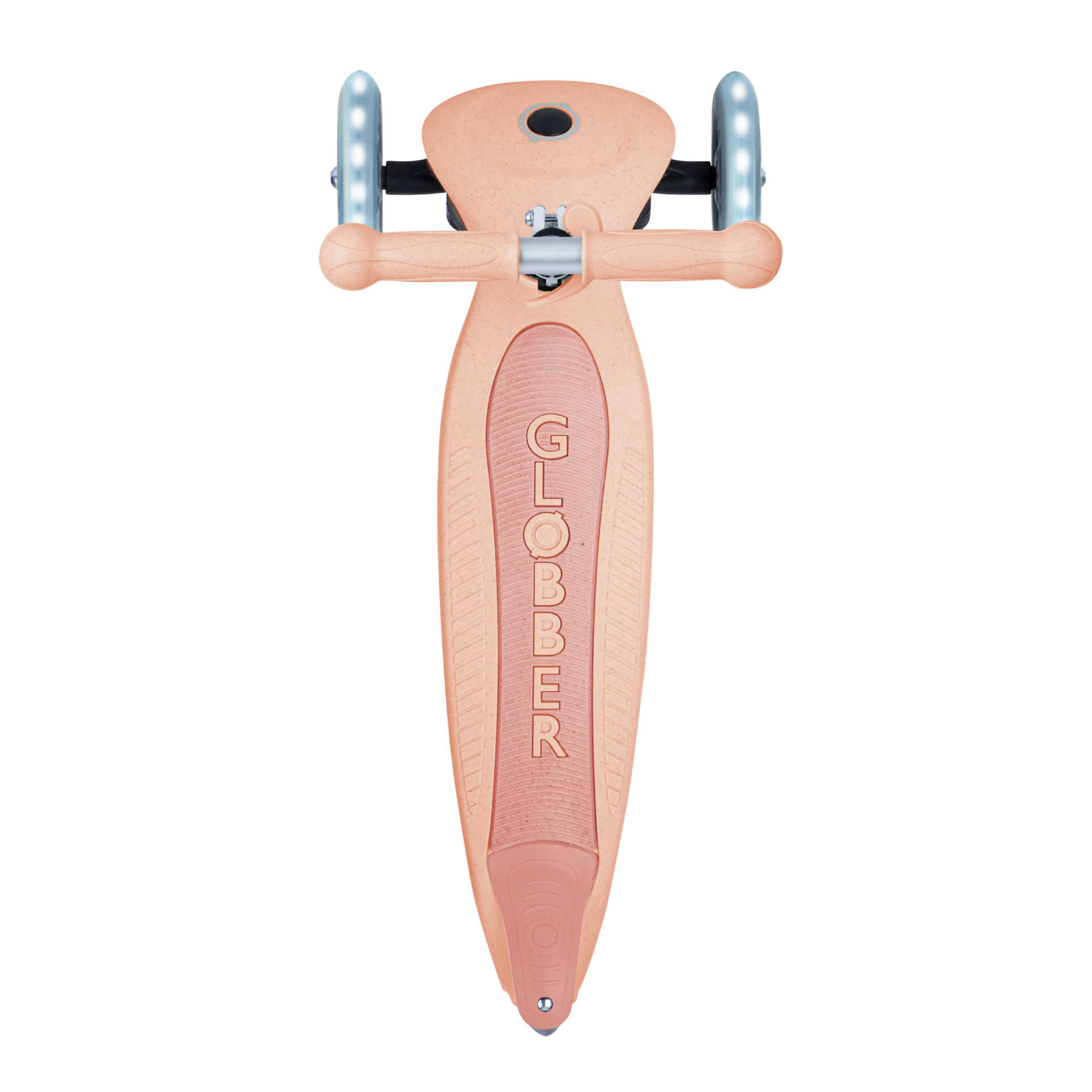 Genießen Sie beleuchtete Roller-Tage mit PRIMO FOLDABLE LIGHTS ÖKOLOGISCH! Dieser beleuchtete 3-Rad-Scooter für Kinder hat LED-Vorderräder, die in Blau, Grün und Rot blinken und so den ganzen Tag lang für ein farbenfrohes Fahrvergnügen sorgen. Es sind keine Batterien erforderlich, da die leuchtenden Räder mit Dynamo-Beleuchtung ausgestattet sind. Der Roller wird ausschließlich mit der kinetischen Energie betrieben, die durch die Fahrleistung Ihres Kindes erzeugt wird, und ist somit völlig batterielos!
