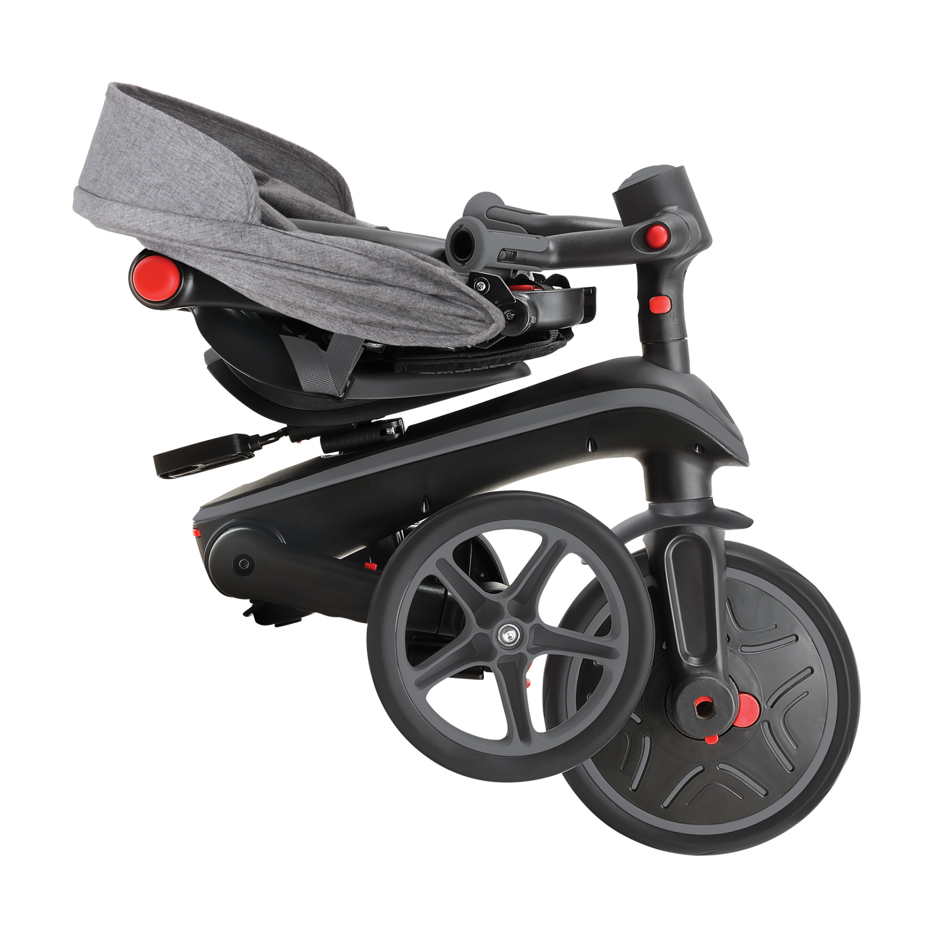 Das EXPLORER TRIKE 4in1 vereint vier Fahrmodi in einem: Baby-Klapprad, geführtes Dreirad mit Schubstange, Trainings-Dreirad und Laufrad – der werkzeuglose Moduswechsel erfolgt per Knopfdruck.