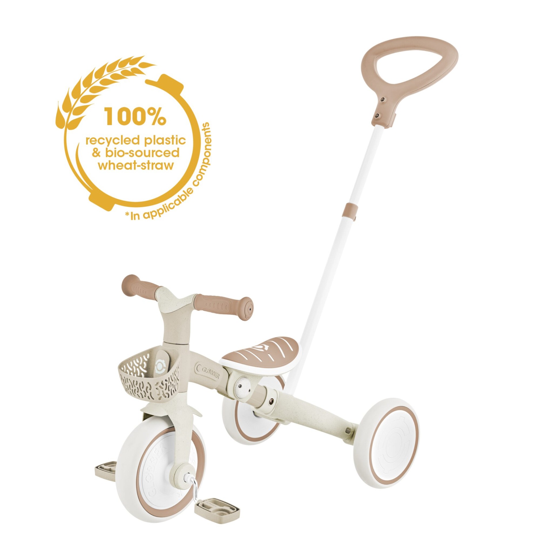 Mit dem LEARNING TRIKE 3in1 PLUS ECOLOGIC entdeckst du eine rundum nachhaltige Mobilitätslösung für Kleinkinder von 12 bis 36 Monaten. Dank des patentierten Radwechsel-Mechanismus wandelst du das Gefährt im Handumdrehen vom geführten Dreirad zum Trainings-Trike und schließlich zum Laufrad – ganz ohne Werkzeug.