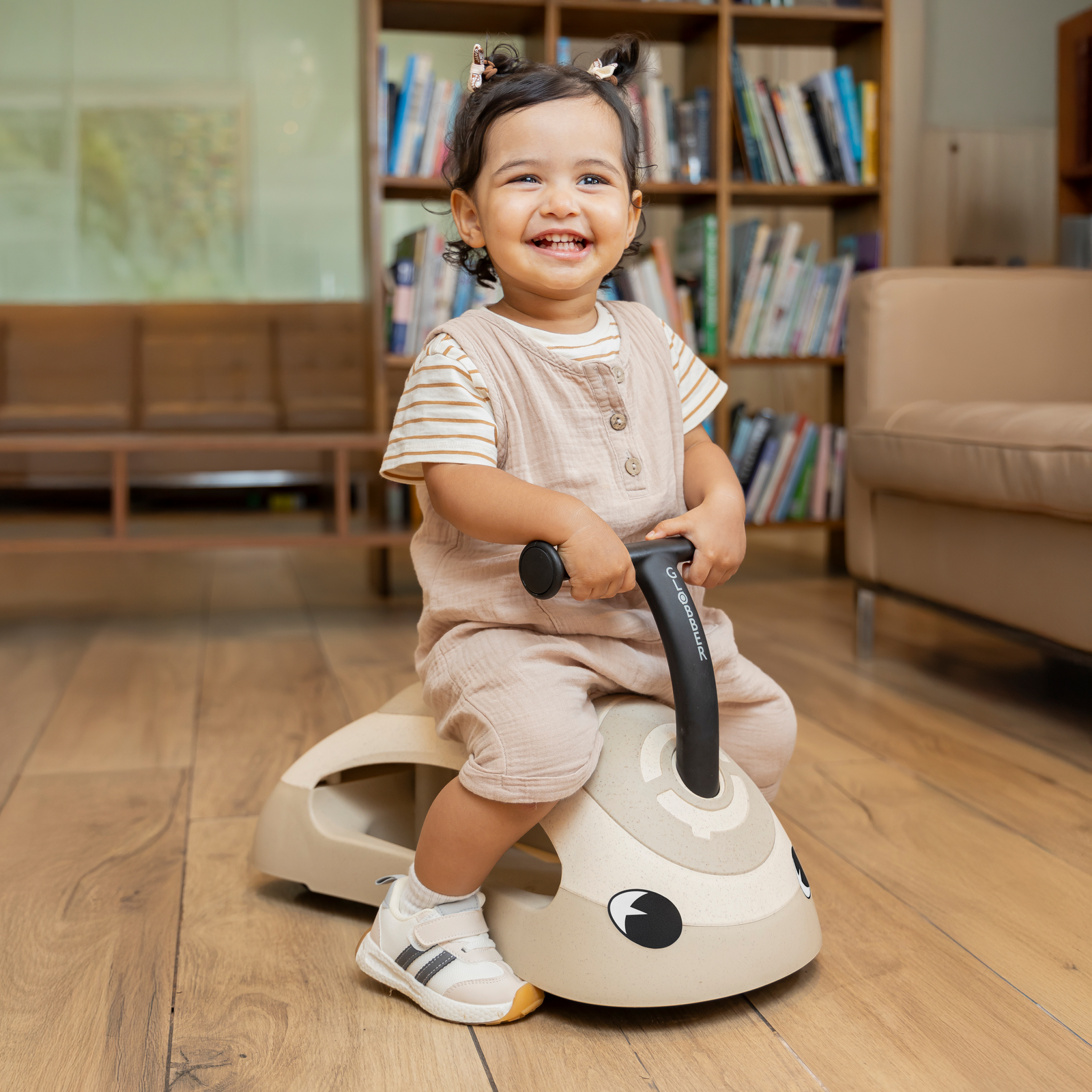 Dreh einfach die T‑Bar um und klapp die Spezial‑Räder ein oder aus – ganz ohne Werkzeug. So förderst du selbstbewusstes Sitzen und stolze Lauf-Meilensteine mit maximalem Spielspaß und Sicherheit.