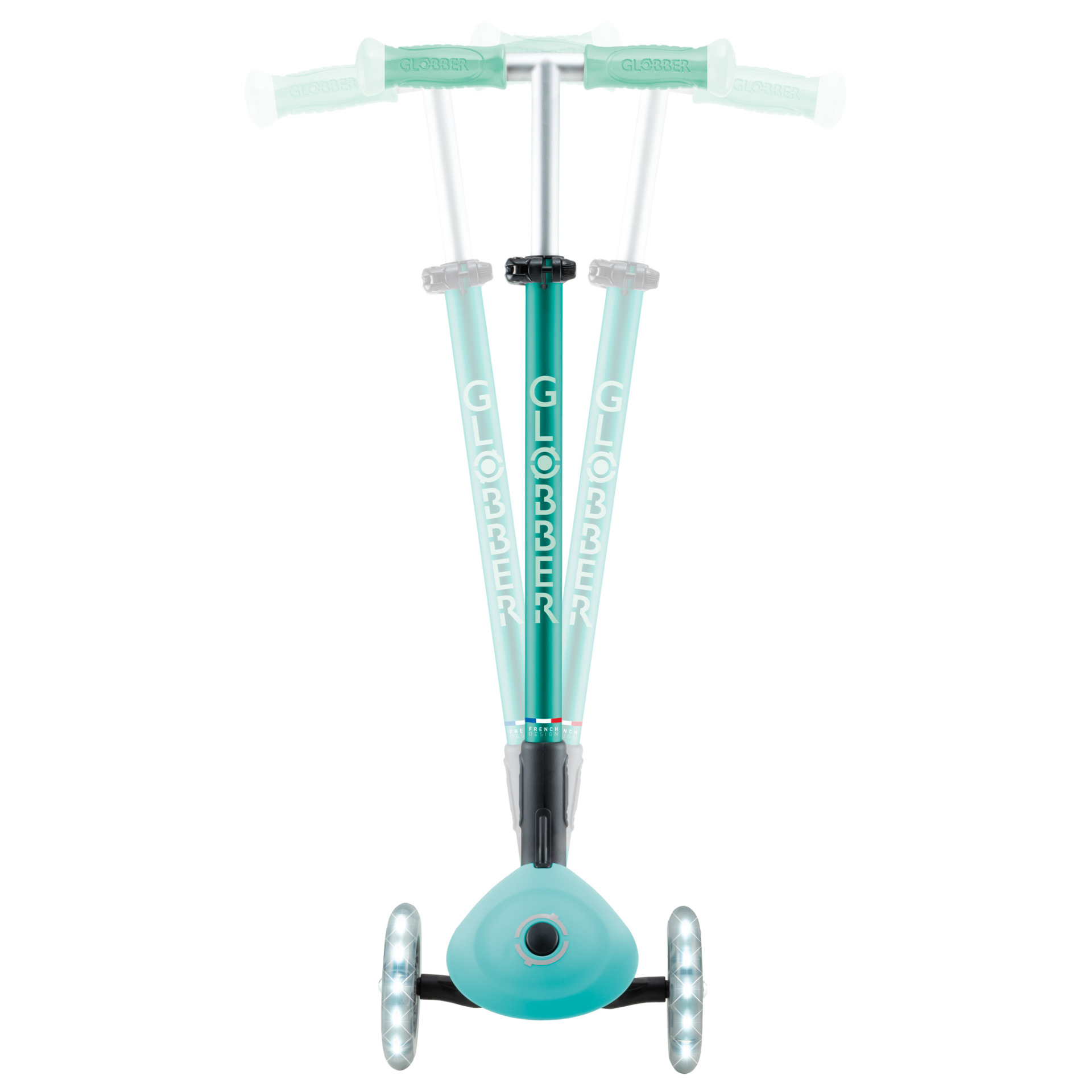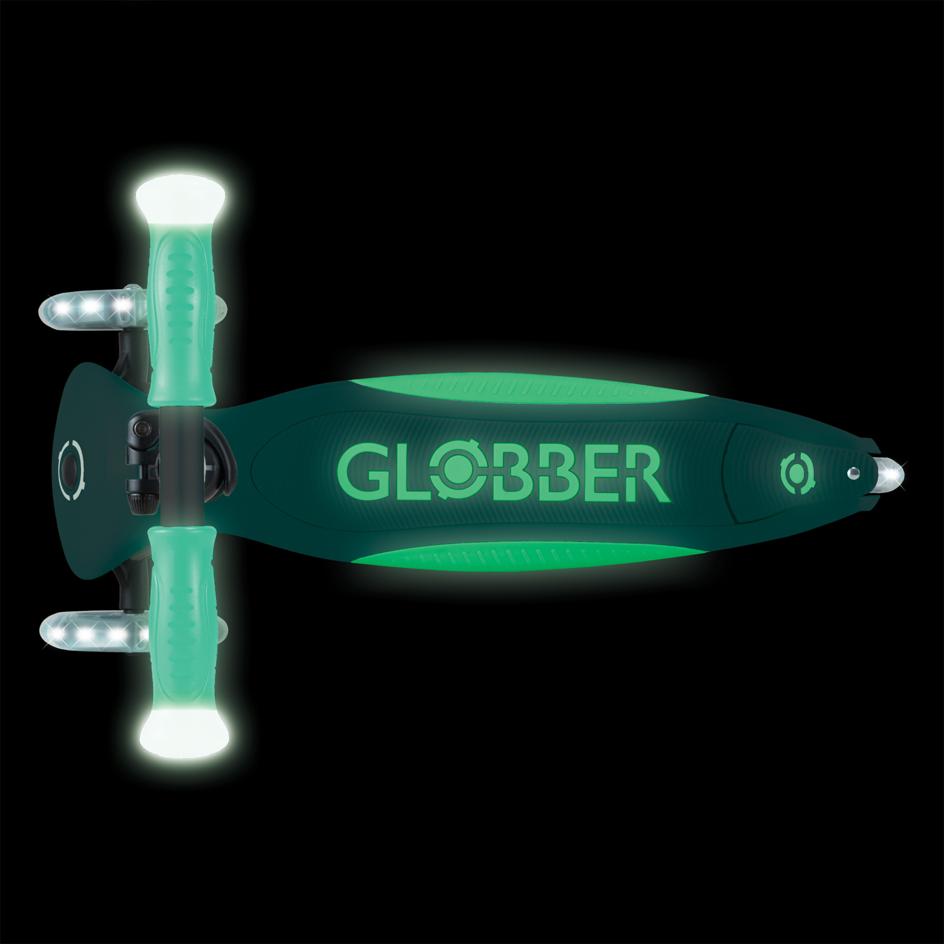 ELITE LIGHTS GLOW также оснащен запатентованной системой блокировки руля и складывания Globber, прочной противоскользящей декой, T-образной ручкой с 4 уровнями регулировки высоты и светящимися ручками LED, а также светящимися белым светом колесами LED без батареек — как передними, так и задними — для еще более ярких поездок!