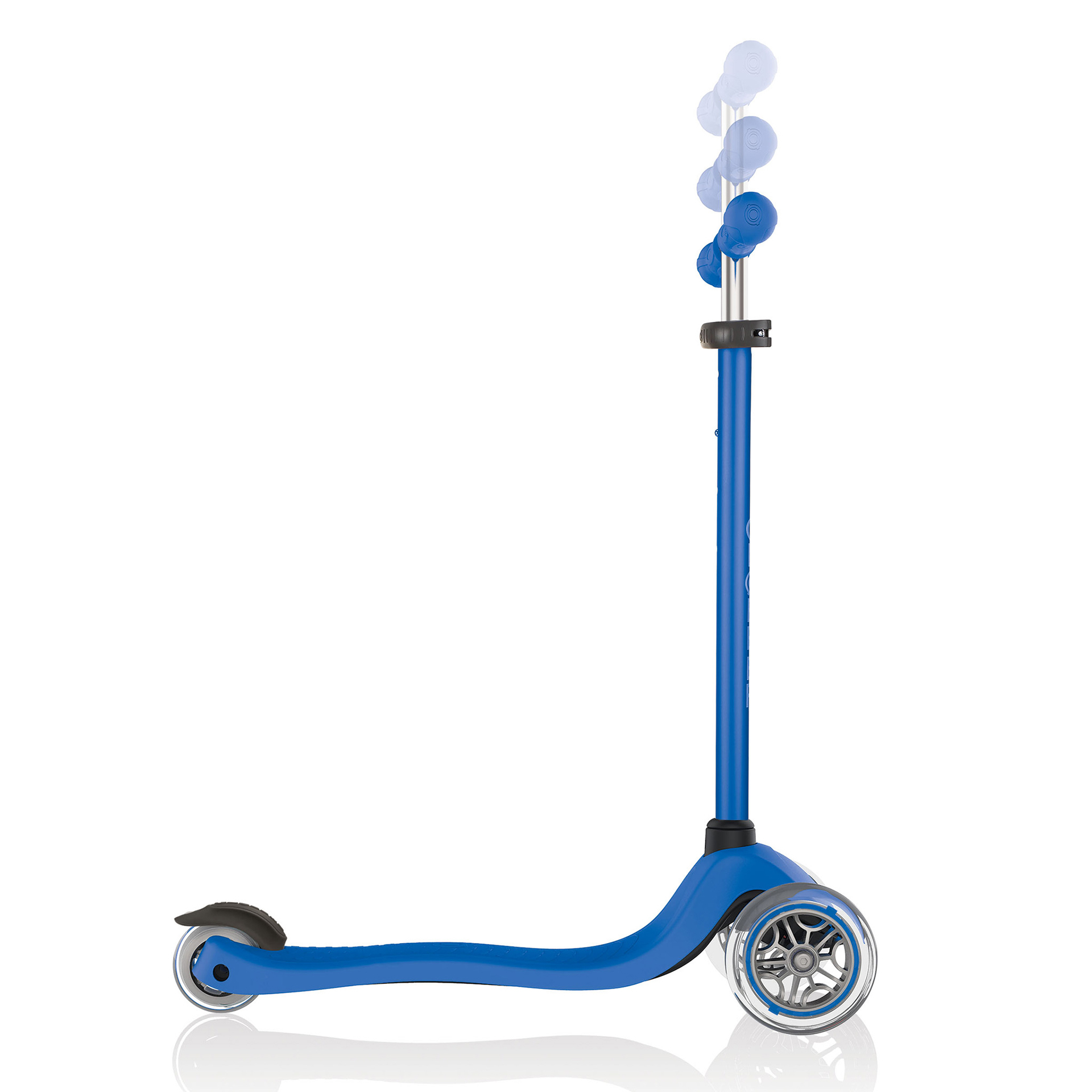 PRIMO comes with a Globber-patented steering lock system that locks the front scooter wheels to only move forward and backward, for kids to gain confidence to scoot while practicing balance skills. To go full-on scooting mode and enable lean-to-steer riding, simply release the steering lock button found on the base of the 3-wheel scooter deck!